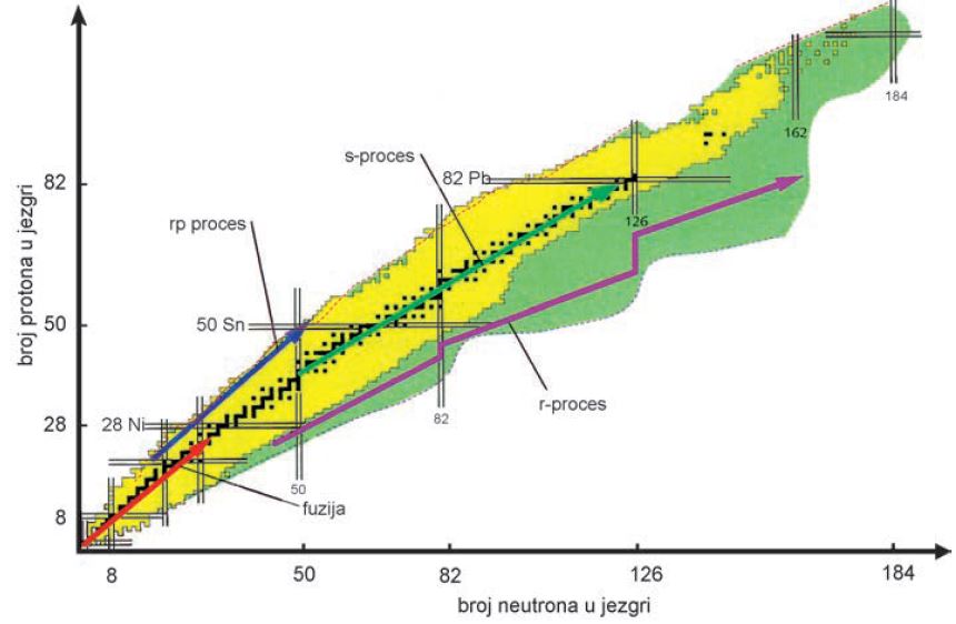 Što je prikazano žutom bojom na karti atomskih jezgara?